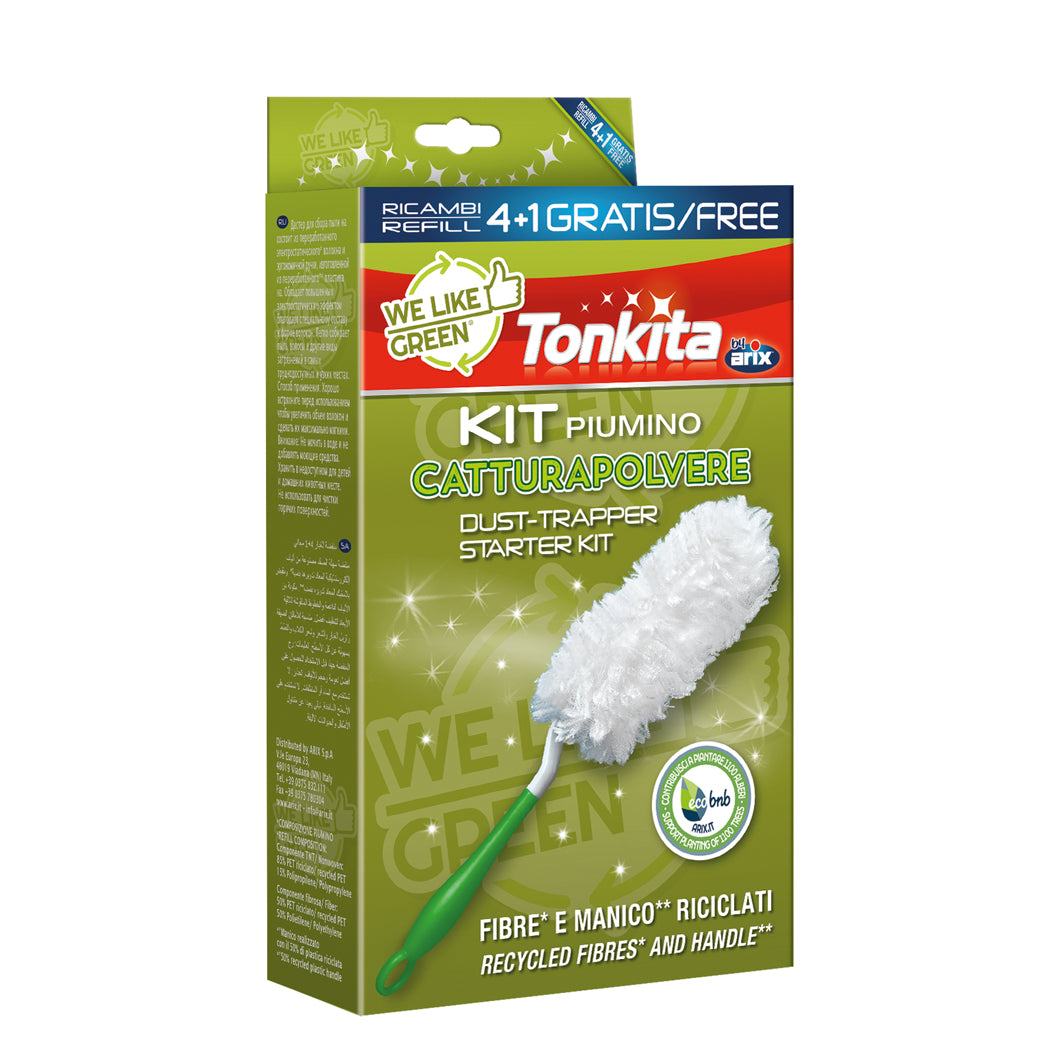Easy grip duster with recycled electrostatic fibres and recycled plastic handle.